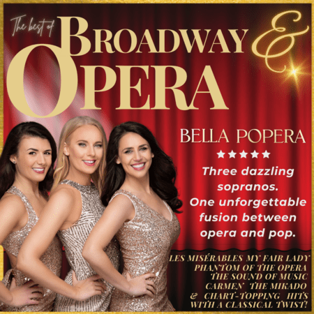 Broadway’s greatest hits meet the world’s most beloved operas in one spectacular show! Three dazzling sopranos — Bella Popera — deliver captivating classical crossover renditions from Phantom of the Opera, Les Misérables, and The Sound of Music, alongside operatic masterpieces like Carmen, O Mio Babbino Caro, and The Flower Duet.